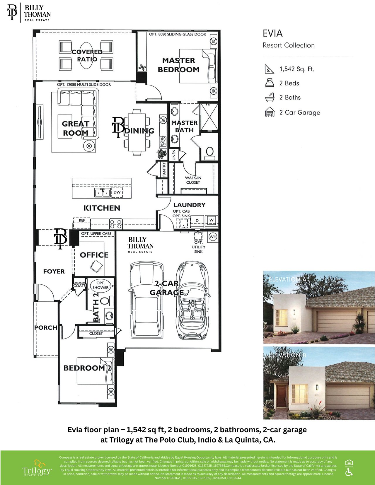 The Evia floor plan spans 1,542 sq. ft. with 2 bedrooms, 2 bathrooms, and a 2-car garage. The layout centers around an open kitchen with large island, a great room with dining, and a covered patio for entertaining. The primary suite with walk-in closet and luxury bath offers privacy, while the additional bedroom and office space enhance versatility. Buyers seeking newer resale homes in La Quinta and Indio will find the Evia a perfect match.