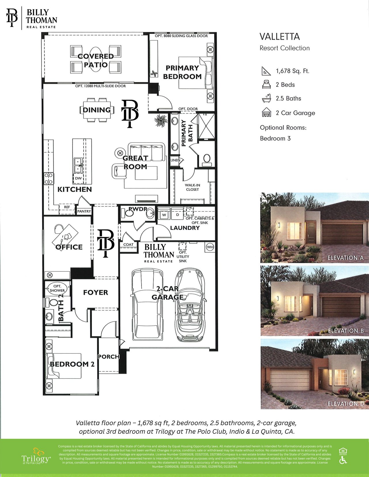 The Valletta floor plan offers 1,678 sq. ft., designed with 2 bedrooms, 2.5 bathrooms, and a 2-car garage. Flexible options allow for an additional 3rd bedroom, making this plan ideal for guests or multi-generational living. Features include a large great room, dining area, and open kitchen with island, plus a covered patio for year-round enjoyment. With its balance of functionality and style, the Valletta stands out among resale homes at Trilogy in La Quinta and Indio, CA.