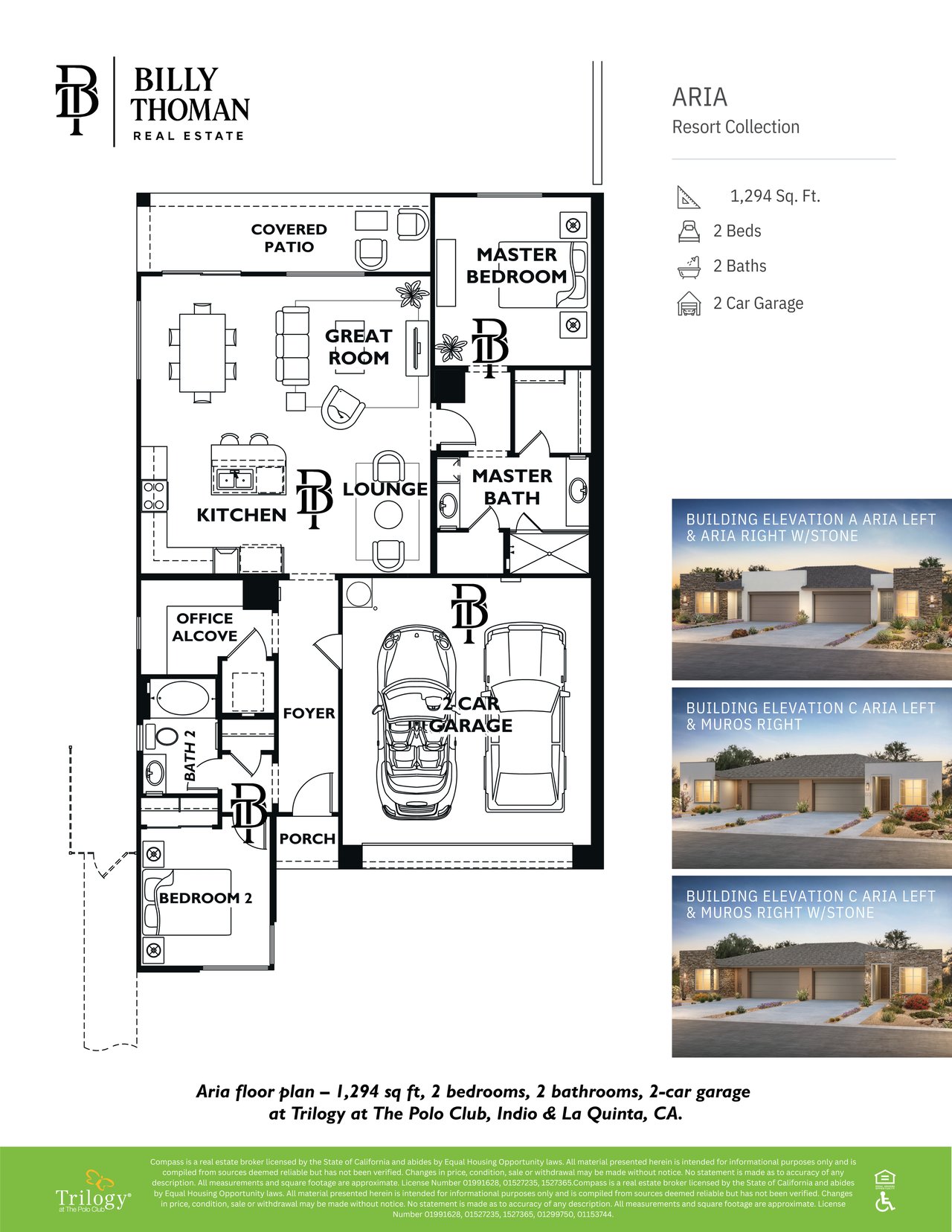 The Aria floor plan offers 1,294 sq. ft., featuring 2 bedrooms, 2 bathrooms, and a 2-car garage. With a spacious great room and open kitchen with island, this design maximizes efficiency and flow. The covered patio and lounge area extend living outdoors, while the primary suite with walk-in closet provides comfort and privacy. Perfect for those seeking low-maintenance homes for sale in La Quinta or Indio, CA, the Aria combines smart design with desert lifestyle charm.