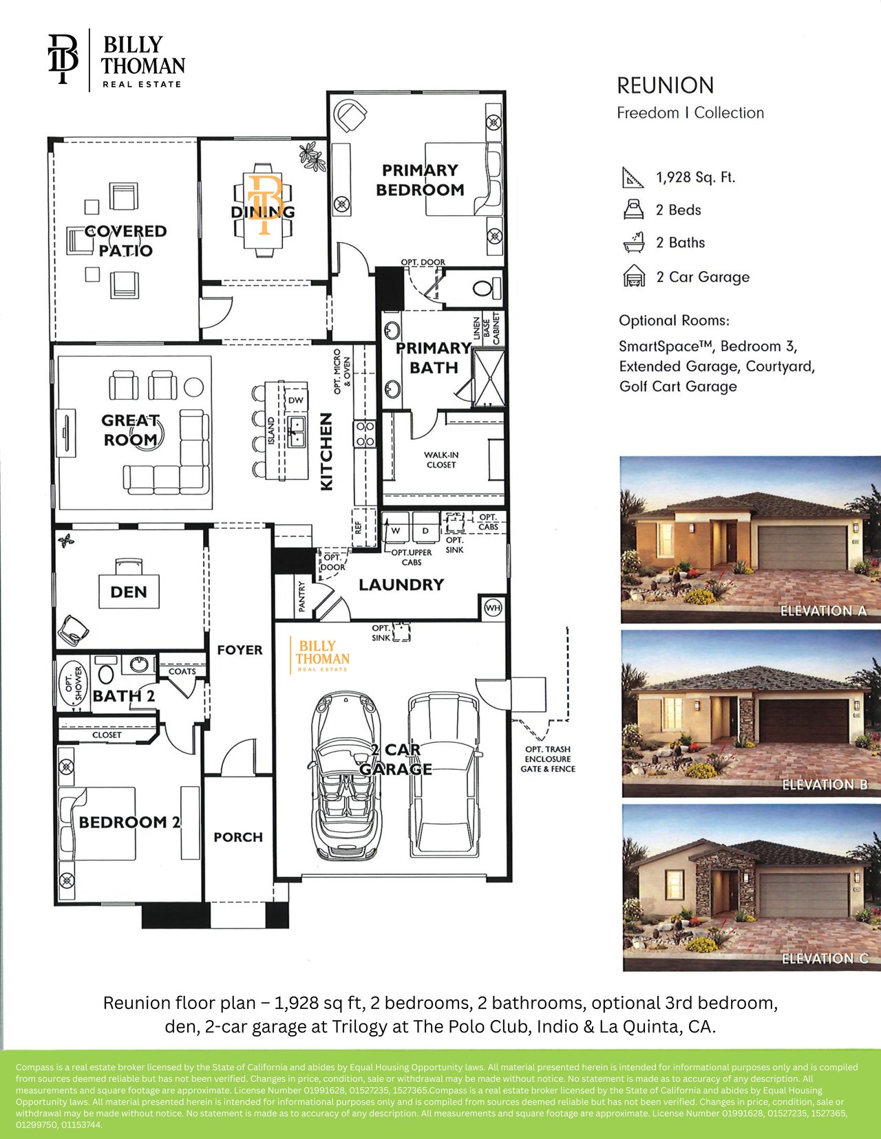 Reunion – 1,928 sq. ft., 2 Beds + Den (Optional 3rd Bedroom), 2 Baths, 2 Car Garage