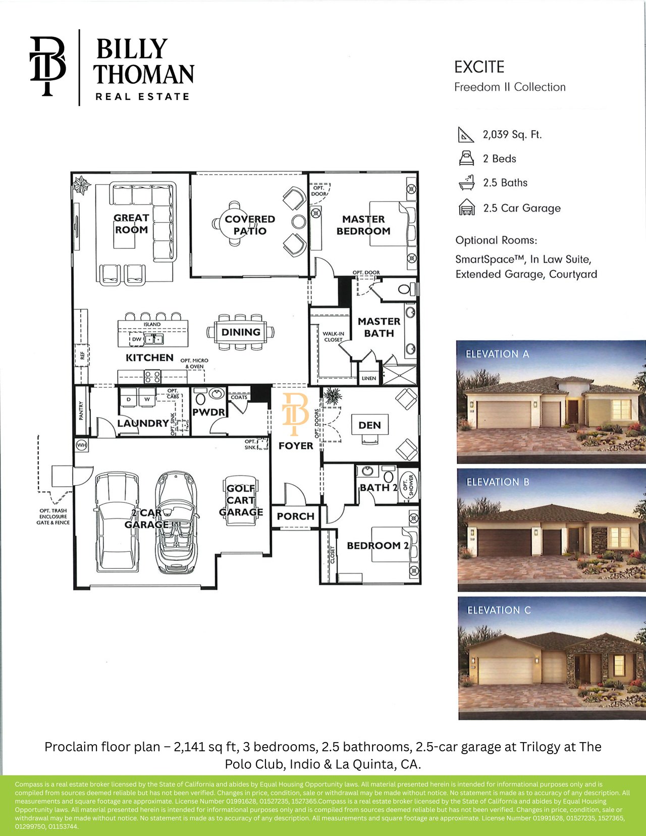 The Excite floor plan at Trilogy at The Polo Club delivers 2,039 sq. ft. of sophisticated design with 2 bedrooms, 2.5 bathrooms, and a 2.5-car garage. Featuring an open-concept great room, dining, and gourmet kitchen with large island, Excite is perfect for entertaining and everyday living. The primary suite includes a spa-like bath and generous walk-in closet, while a private den adds flexibility for a home office or guest space. Options include an in-law suite, SmartSpace™, extended garage, and courtyard. For buyers seeking luxury homes for sale in La Quinta and Indio, CA, Excite offers elegance with modern desert convenience.