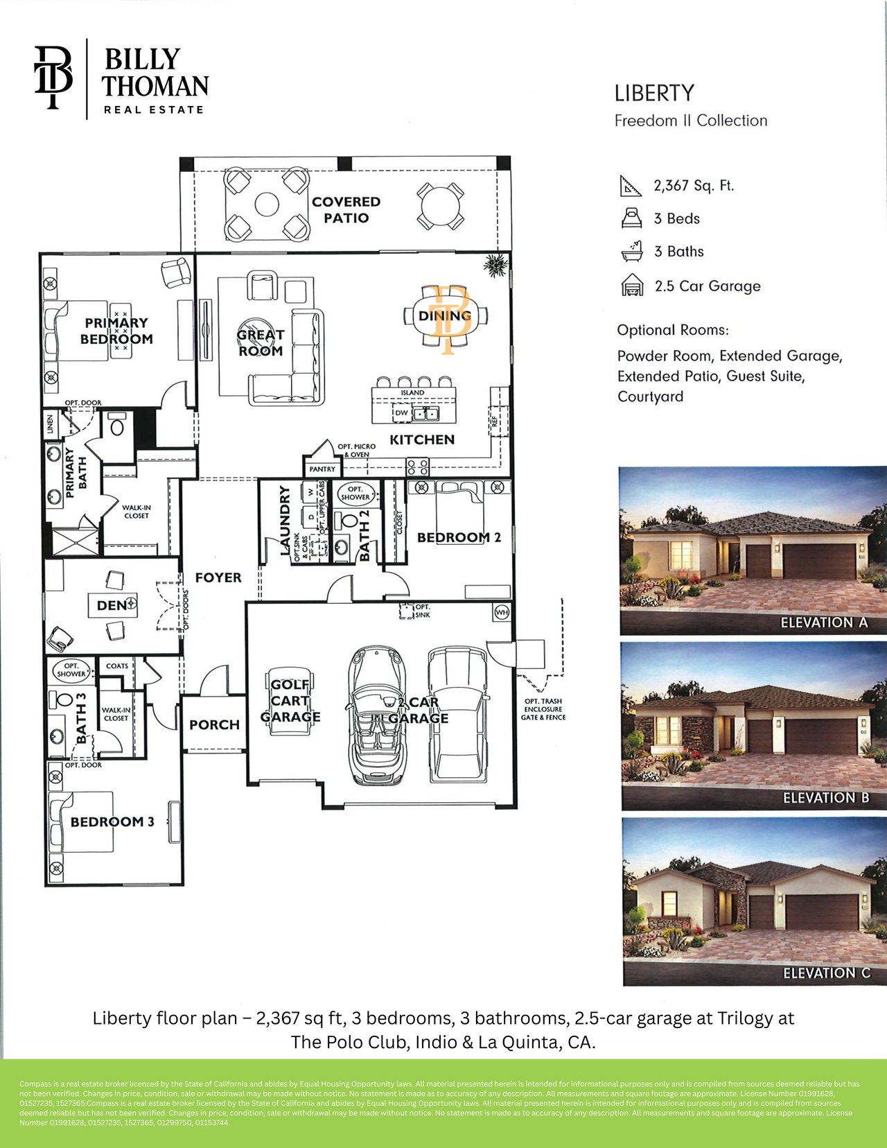 The Liberty floor plan at Trilogy at The Polo Club offers 2,367 sq. ft. of expansive living space with 3 bedrooms, 3 bathrooms, and a 2.5-car garage. Designed for those who value both style and functionality, Liberty features a spacious great room and gourmet kitchen with island, flowing seamlessly into the dining area and covered patio. A luxurious primary suite with walk-in closet anchors the design, while secondary bedrooms provide private retreats for family or guests. With flexible options like a guest suite, extended garage, powder room, or courtyard, Liberty is perfect for buyers seeking resort-style homes in La Quinta or Indio, CA.