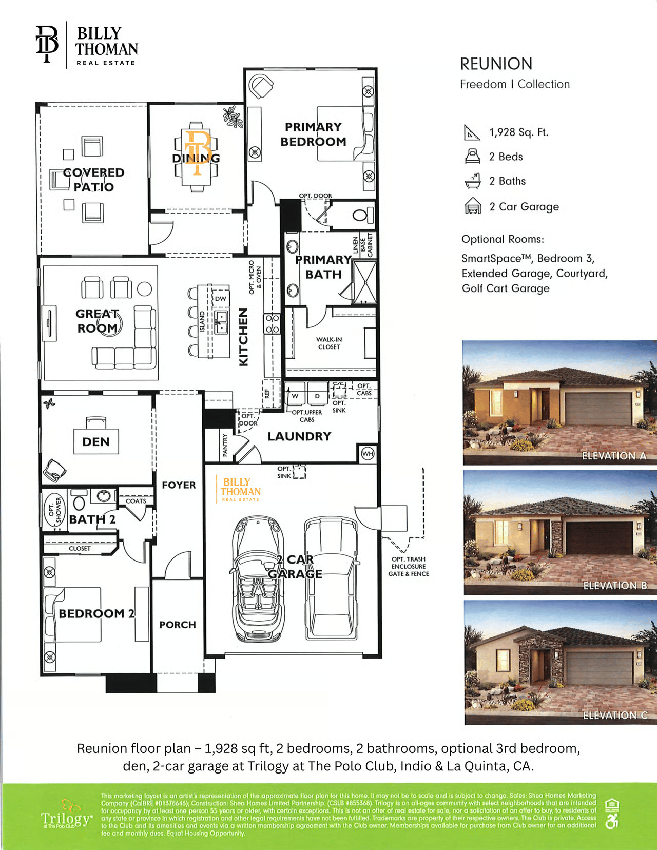 The Reunion floor plan at Trilogy at The Polo Club delivers 1,928 sq. ft. with 2 bedrooms, 2 bathrooms, and a 2-car garage, plus an optional 3rd bedroom. This expansive home is ideal for buyers who want flexibility and space. The open great room, gourmet kitchen with island, and dining area connect to the covered patio, perfect for entertaining. The primary suite features a walk-in closet and elegant bath, while the den or optional 3rd bedroom provides versatility for guests, hobbies, or a home office. For those searching homes for sale in Indio and La Quinta, CA, the Reunion combines modern design with resort-style living.