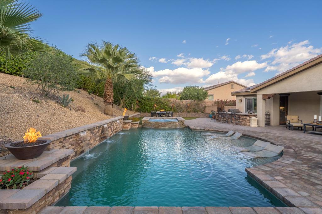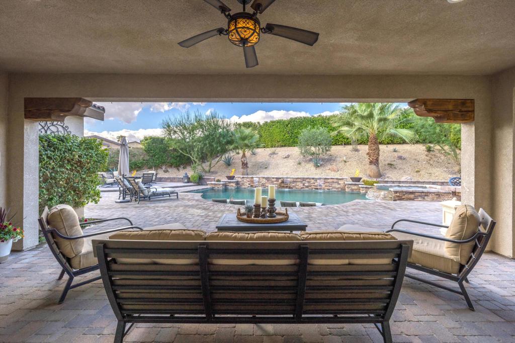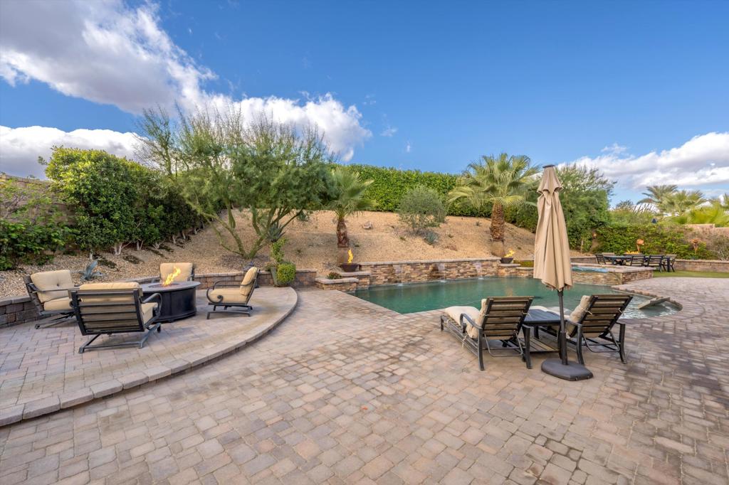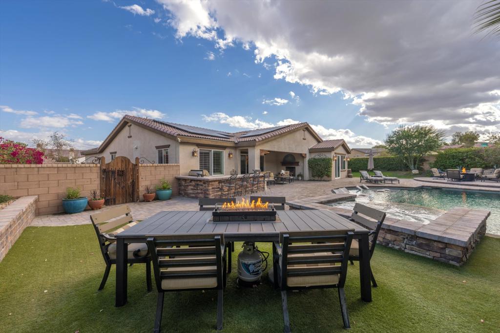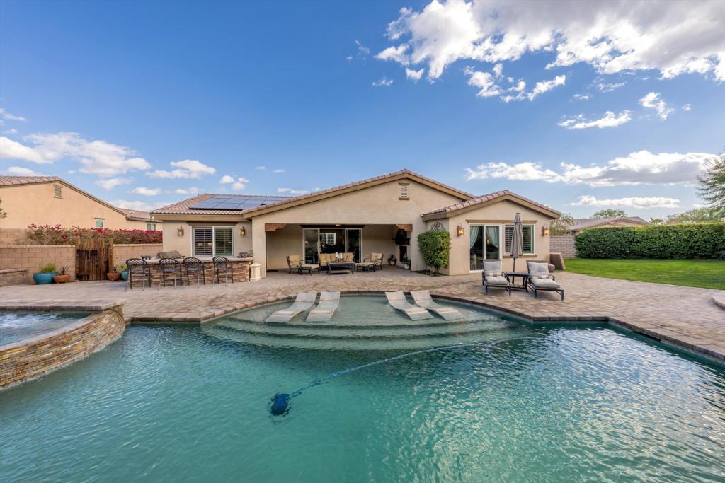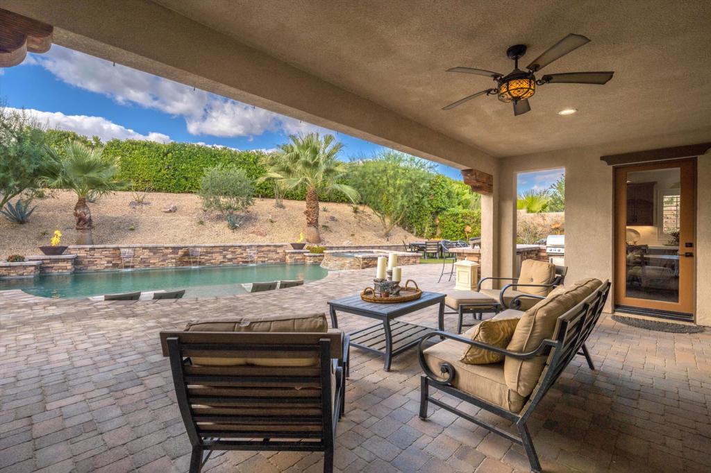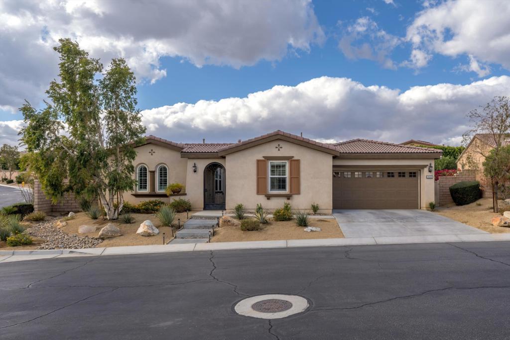 Huge lot with Pool & Spa! Nestled in the heart of the Coachella Valley, this exquisite home offers a seamless blend of comfort and luxury. The main house features an open layout with three bedrooms, three baths, and a versatile den, while a private casita with one bedroom and one bath provides an ideal space for guests or a personal retreat. The kitchen, updated in 2022, is a culinary enthusiast's dream. It combines functionality with style, boasting sleek stainless appliances, extensive cabinetry, a large island, and porcelain countertops--perfect for both everyday cooking and lavish gatherings. Low maintenance, wood laminate flooring extends throughout the home, accented by crown molding and 5-inch baseboards. The primary bathrooms have been upgraded with designer tile, adding a touch of sophistication. Situated on an oversized corner lot, the property is designed for exceptional indoor/outdoor living. The expansive back and side yards feature a sparkling pool and spa, decorative fire bowl accents, a built-in BBQ with counter, a misting system, and extensive pavers--perfect for relaxation and entertainment. Additionally, the home is equipped with a solar energy system, enhancing its modern appeal. This remarkable Palm Desert oasis embodies the essence of sophisticated living, offering a unique opportunity to enjoy the best of the Coachella Valley lifestyle.