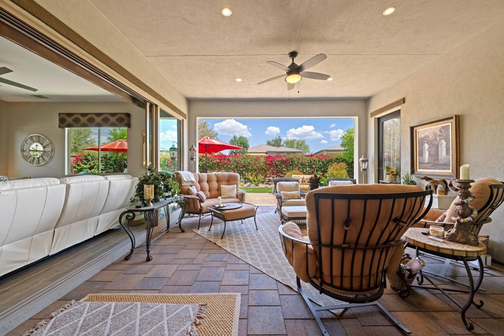 Single story home at Trilogy at The Polo Club featuring rolling glass doors, modern upgrades, seamless indoor outdoor living, and access to resort style amenities in Indio.Welcome to 50780 Harps Canyon Drive, a beautifully upgraded residence located within the prestigious gated community of Trilogy at The Polo Club. Offering 2 bedrooms, 2.5 bathrooms, and 2,039 sq ft of thoughtfully designed living space, this home blends sophistication, comfort, and effortless desert living.Inside, 10 foot ceilings and 8 foot doors create an open and airy atmosphere, complemented by elegant tile flooring throughout the main living areas. The chef's kitchen serves as the heart of the home, featuring a commercial grade gas cooktop with hood, stainless steel appliances, soft close cabinetry, and pull out shelves, ideal for both entertaining and everyday living.Two rolling glass doors enhance the seamless indoor outdoor flow, opening to a beautifully paved patio designed for relaxing or hosting gatherings. An electric patio screen provides year round comfort while maintaining the connection between indoor and outdoor spaces. The low maintenance backyard offers privacy and a tranquil setting, perfect for enjoying the desert lifestyle.The home includes upgraded bathrooms, custom valances, electric window shades, five inch base molding, and custom paint, with thoughtful attention to detail throughout. An oversized two car garage is EV ready and includes an additional golf cart garage, offering added functionality and convenience.Situated adjacent to a scenic walking path, this home enjoys a balance of privacy and connection within the community. A Polo Club membership is available with a transfer fee, providing access to the Polo Club, fitness center, pickleball and tennis courts, resort and lap pools, artisan studio, card room, banquet facilities, indoor golf simulator, billiards, and a vibrant social calendar.This is a refined opportunity to enjoy modern single story living in one of Indio's most sought after resort communities.