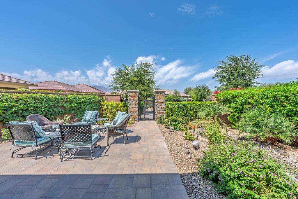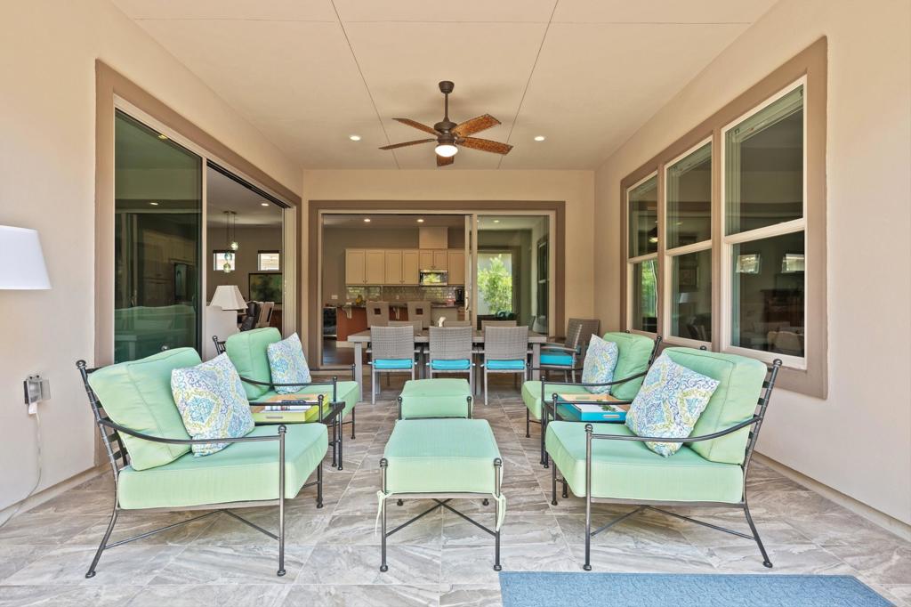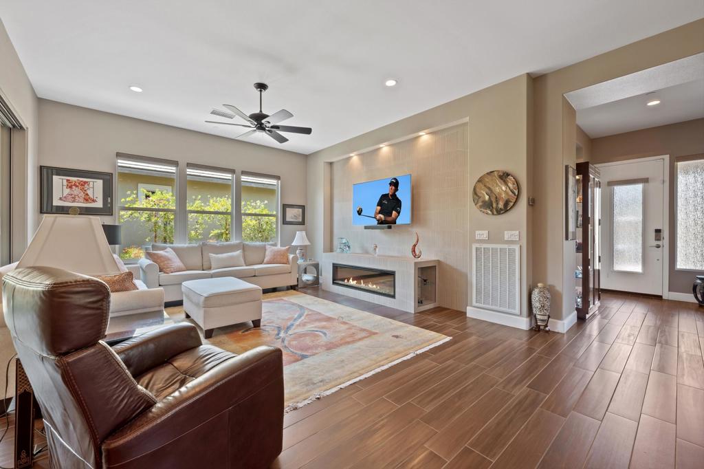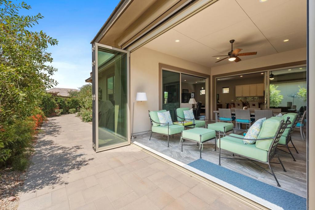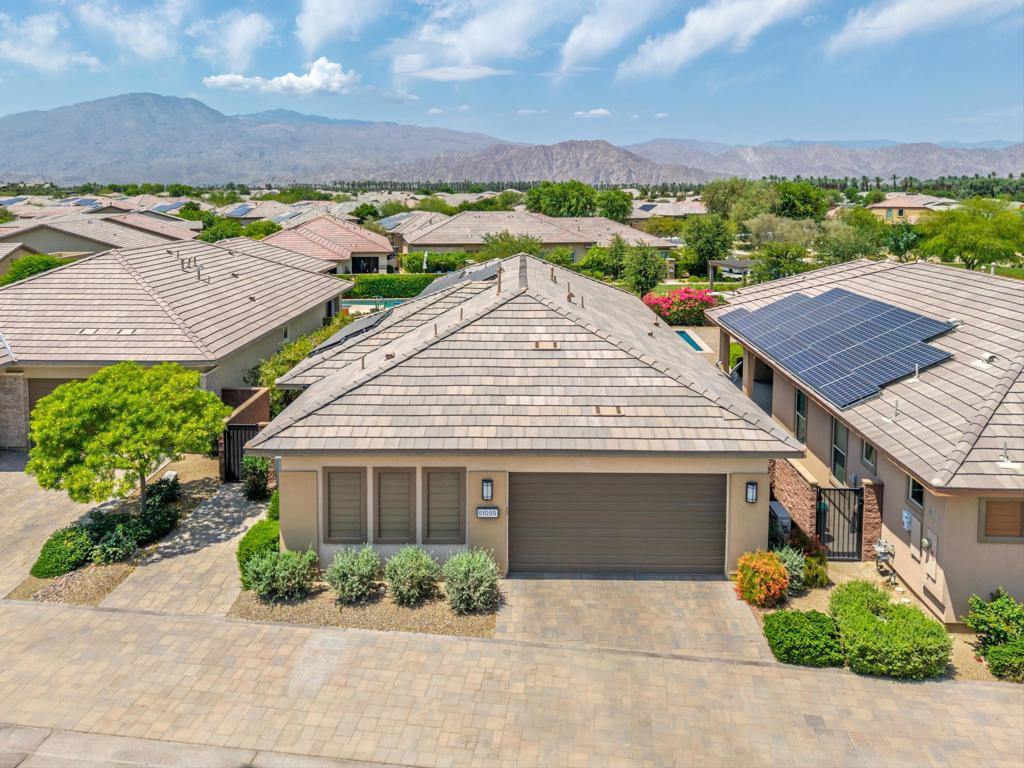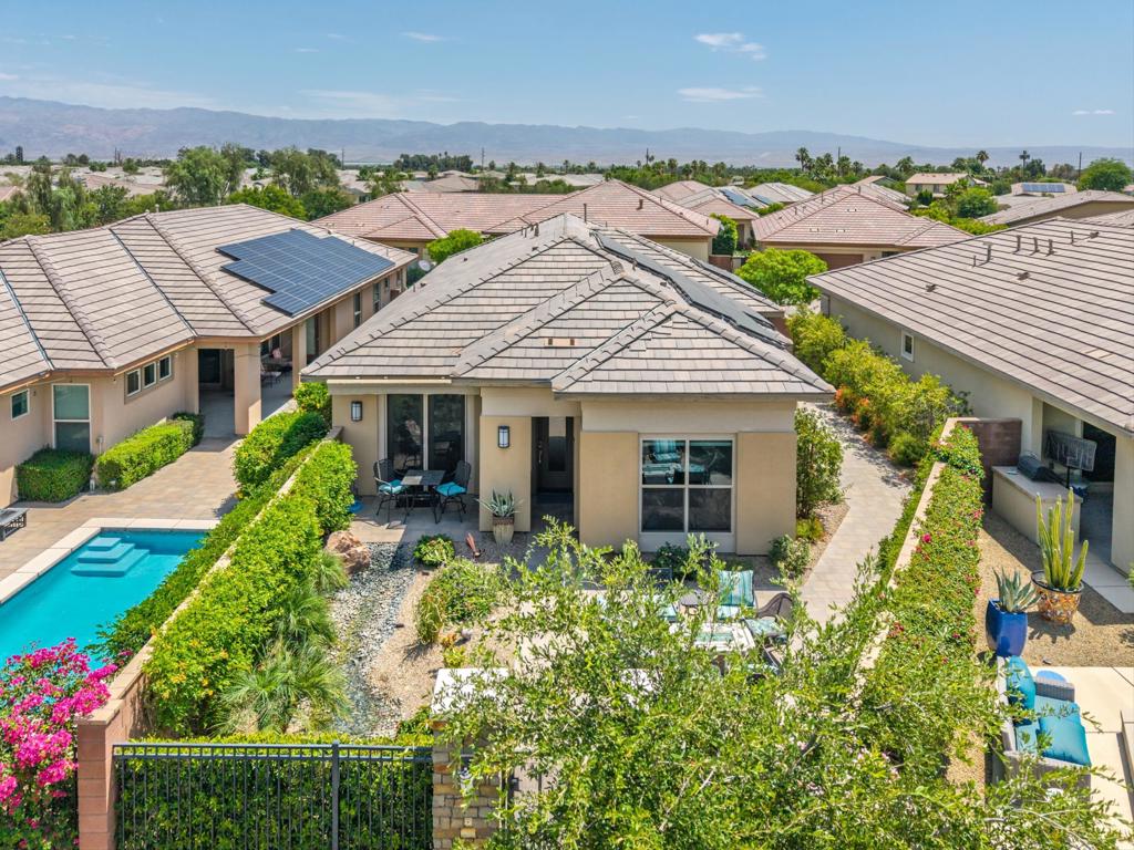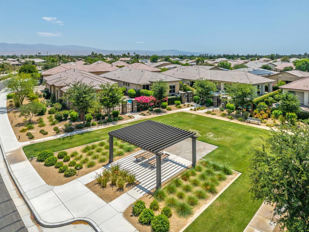 Welcome to resort-style living in the 'All Ages' section of the sought-after Trilogy at the Polo Club. This beautifully upgraded Solare floor plan offers 1,902 square feet of thoughtfully designed space, with soaring 10' ceilings and an open concept layout that blends comfort, elegance, and function.The heart of the home is the kitchen and great room, seamlessly connected and ideal for entertaining. Designer tile flooring flows throughout, complemented by dramatic granite slab countertops and a striking tiled fireplace wall. Two expansive rolling glass doors create a true indoor/outdoor living experience, opening to a spacious patio. The patio features a folding glass enclosure, adding up to 270 square feet of additional living space year-round.The smart space laundry room offers generous storage, natural light, and multiple workstations. The primary suite features a large walk-in shower and walk-in closet, while the den provides serene views of the patio and adjacent park. The upgraded garage includes built-in storage and A/C, perfect for year-round use.Outside, enjoy two distinct patio areas--one facing south and one west--each maximizing outdoor enjoyment and capturing the desert light. The front patio includes a tranquil water feature and opens to a lush, oversized park, offering privacy and peaceful views.The home also features SheaXero, a solar energy system designed to offset the homes annual electric costs for the next 10 years. A Polo Club Membership is available for transfer (buyer to pay $1,875 fee), granting access to a 25,000 sq ft clubhouse with a fitness center, pickleball, tennis, resort and lap pools, an indoor golf simulator, and more. Dine at June Hill's Table, the on-site restaurant with five-star cuisine and friendly ambiance. All of this, set against the backdrop of the stunning Santa Rosa Mountains.Experience the best of resort living in a home designed for both style and ease. Welcome home.