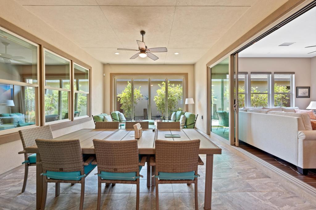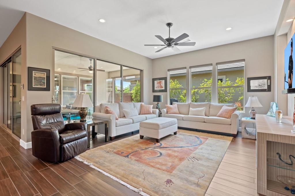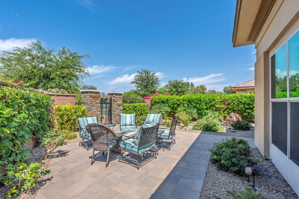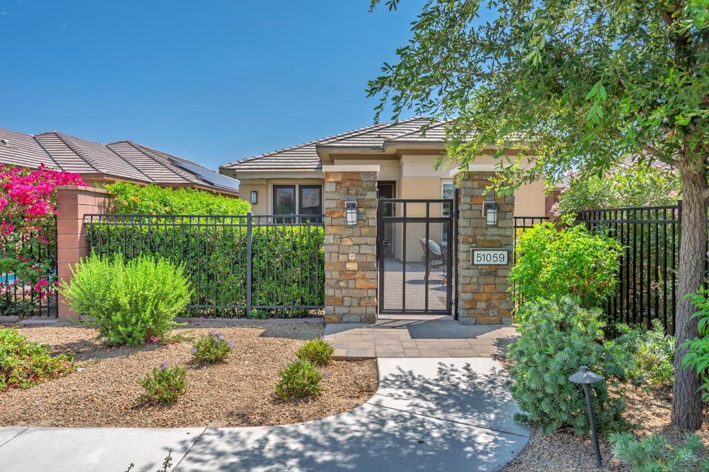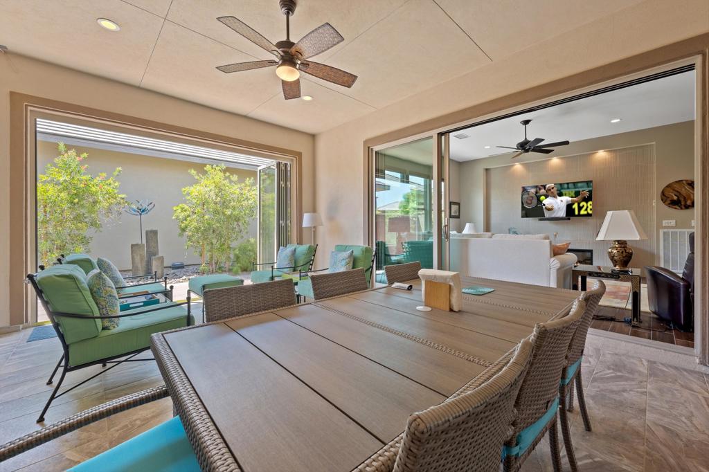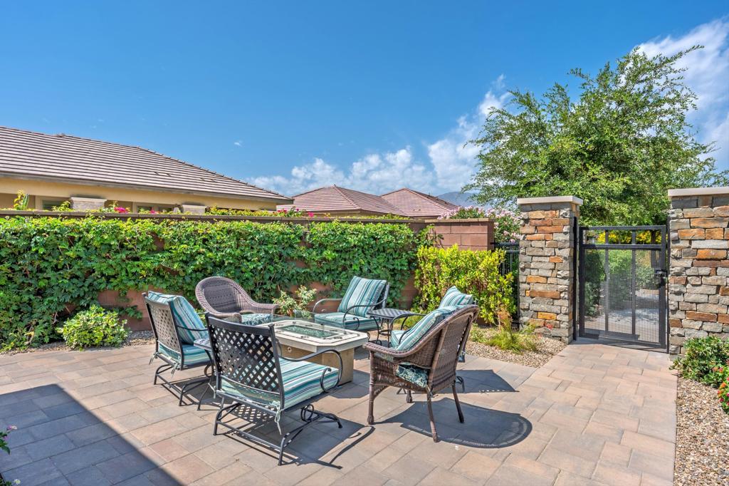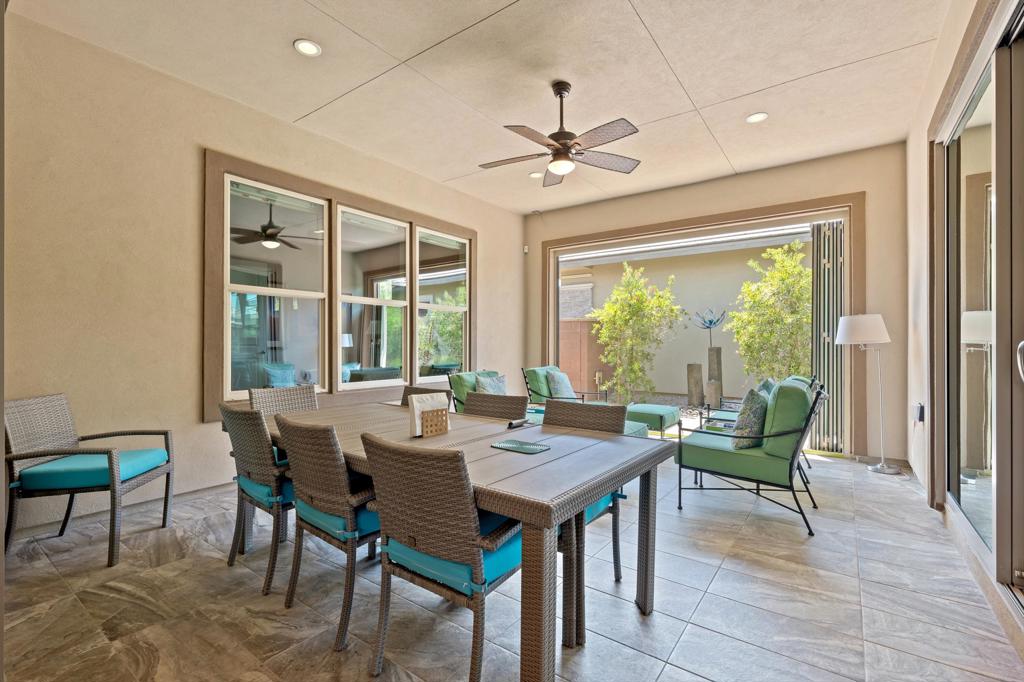 Welcome to resort-style living in the 'All Ages' section of the sought-after Trilogy at the Polo Club. This beautifully upgraded Solare floor plan offers 1,902 square feet of thoughtfully designed space, with soaring 10' ceilings and an open concept layout that blends comfort, elegance, and function.The heart of the home is the kitchen and great room, seamlessly connected and ideal for entertaining. Designer tile flooring flows throughout, complemented by dramatic granite slab countertops and a striking tiled fireplace wall. Two expansive rolling glass doors create a true indoor/outdoor living experience, opening to a spacious patio. The patio features a folding glass enclosure, adding up to 270 square feet of additional living space year-round.The smart space laundry room offers generous storage, natural light, and multiple workstations. The primary suite features a large walk-in shower and walk-in closet, while the den provides serene views of the patio and adjacent park. The upgraded garage includes built-in storage and A/C, perfect for year-round use.Outside, enjoy two distinct patio areas--one facing south and one west--each maximizing outdoor enjoyment and capturing the desert light. The front patio includes a tranquil water feature and opens to a lush, oversized park, offering privacy and peaceful views.The home also features SheaXero, a solar energy system designed to offset the homes annual electric costs for the next 10 years. A Polo Club Membership is available for transfer (buyer to pay $1,875 fee), granting access to a 25,000 sq ft clubhouse with a fitness center, pickleball, tennis, resort and lap pools, an indoor golf simulator, and more. Dine at June Hill's Table, the on-site restaurant with five-star cuisine and friendly ambiance. All of this, set against the backdrop of the stunning Santa Rosa Mountains.Experience the best of resort living in a home designed for both style and ease. Welcome home.