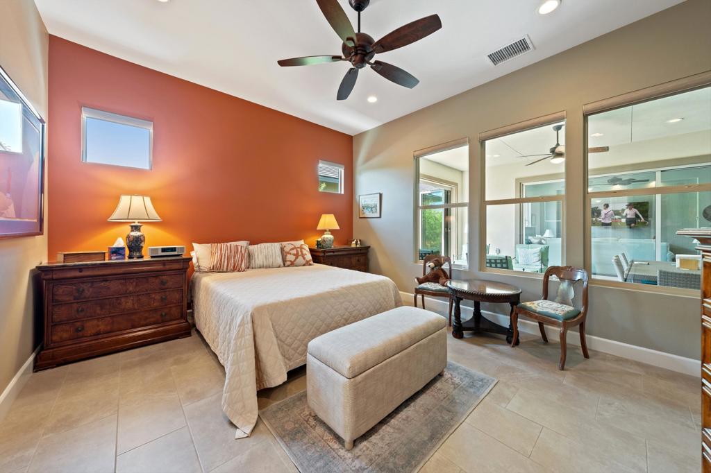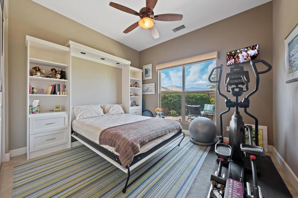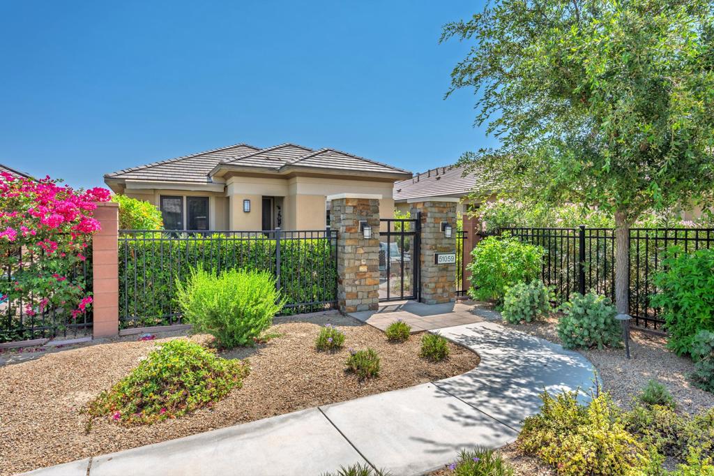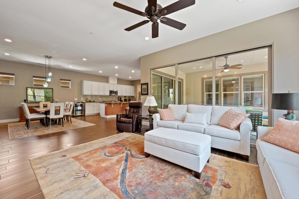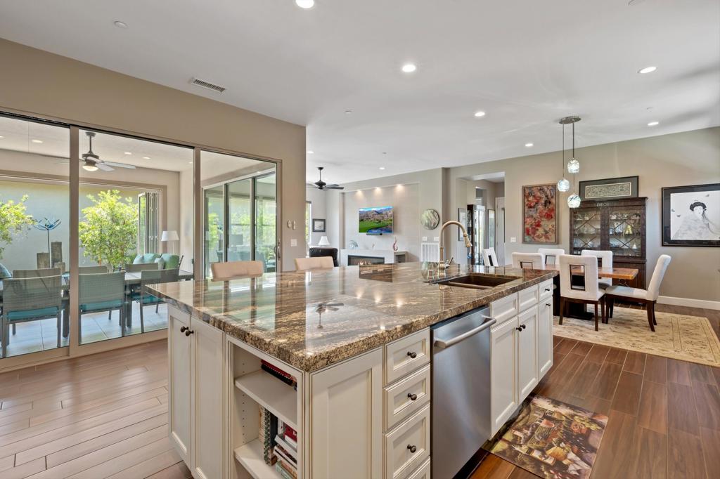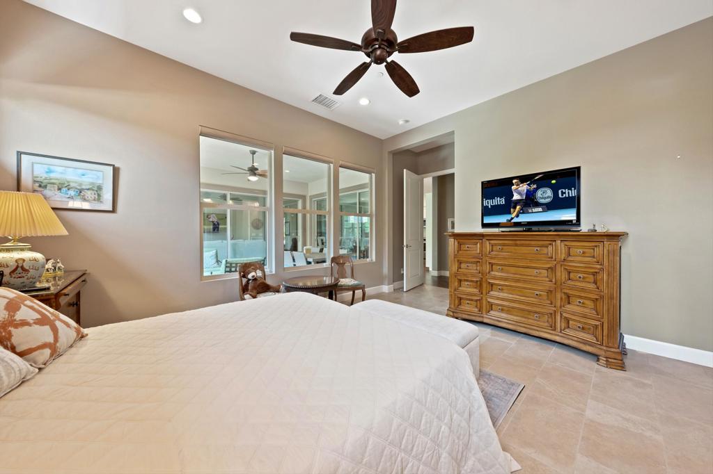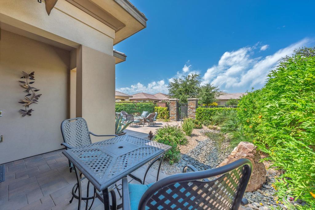 Welcome to resort-style living in the 'All Ages' section of the sought-after Trilogy at the Polo Club. This beautifully upgraded Solare floor plan offers 1,902 square feet of thoughtfully designed space, with soaring 10' ceilings and an open concept layout that blends comfort, elegance, and function.The heart of the home is the kitchen and great room, seamlessly connected and ideal for entertaining. Designer tile flooring flows throughout, complemented by dramatic granite slab countertops and a striking tiled fireplace wall. Two expansive rolling glass doors create a true indoor/outdoor living experience, opening to a spacious patio. The patio features a folding glass enclosure, adding up to 270 square feet of additional living space year-round.The smart space laundry room offers generous storage, natural light, and multiple workstations. The primary suite features a large walk-in shower and walk-in closet, while the den provides serene views of the patio and adjacent park. The upgraded garage includes built-in storage and A/C, perfect for year-round use.Outside, enjoy two distinct patio areas--one facing south and one west--each maximizing outdoor enjoyment and capturing the desert light. The front patio includes a tranquil water feature and opens to a lush, oversized park, offering privacy and peaceful views.The home also features SheaXero, a solar energy system designed to offset the homes annual electric costs for the next 10 years. A Polo Club Membership is available for transfer (buyer to pay $1,875 fee), granting access to a 25,000 sq ft clubhouse with a fitness center, pickleball, tennis, resort and lap pools, an indoor golf simulator, and more. Dine at June Hill's Table, the on-site restaurant with five-star cuisine and friendly ambiance. All of this, set against the backdrop of the stunning Santa Rosa Mountains.Experience the best of resort living in a home designed for both style and ease. Welcome home.