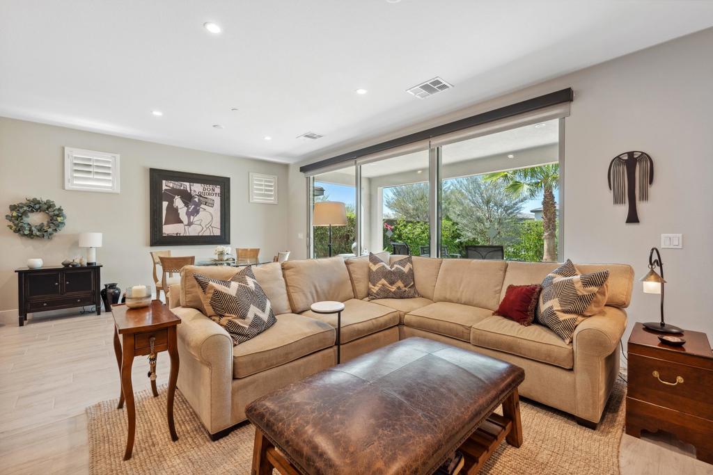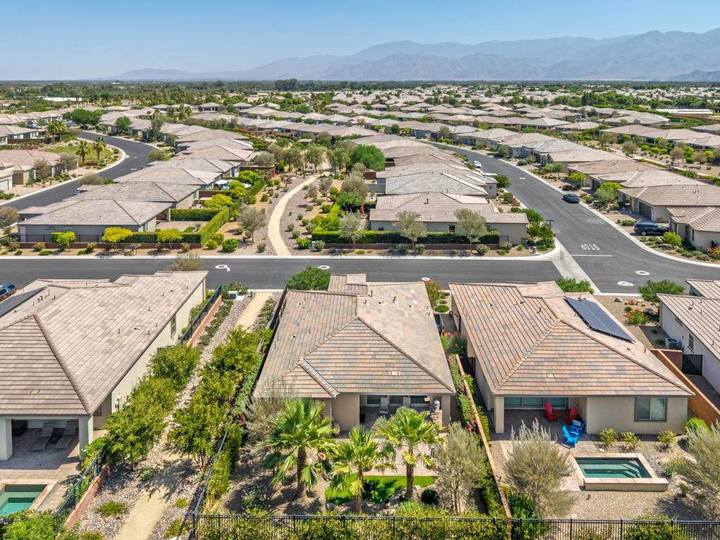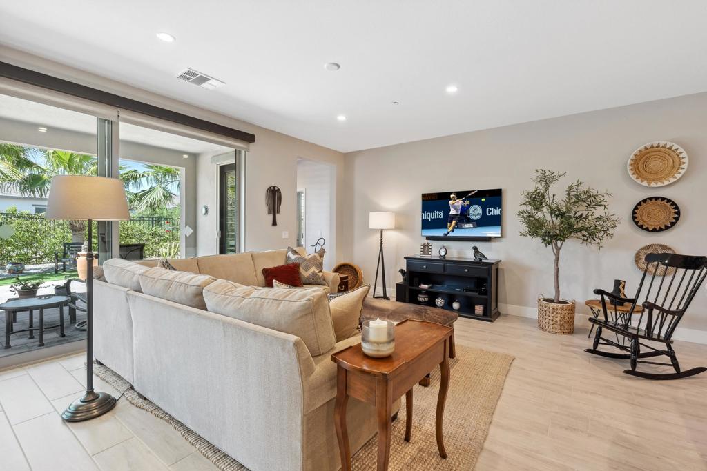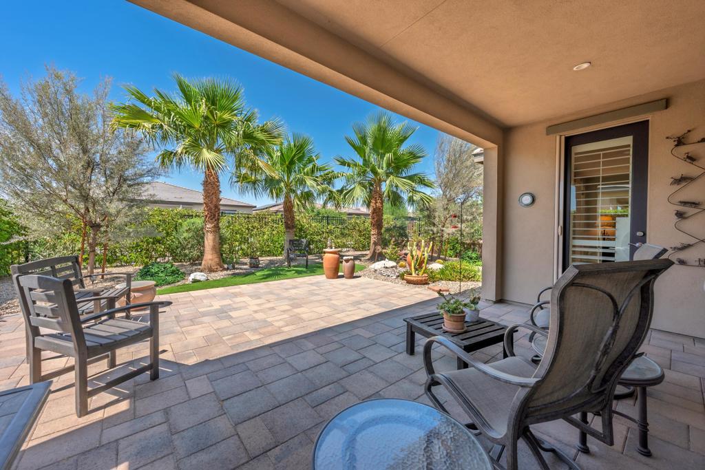 Welcome to an exquisite home in the sought-after Trilogy at the Polo Club, where resort-style living meets everyday elegance. This beautifully upgraded single-story residence offers 1,622 square feet of thoughtfully designed living space with two bedrooms, two bathrooms, and a versatile den--perfect for a home office, media room, or creative studio.Step inside to discover a bright and open floor plan, highlighted by 9' ceilings, stylish tile floors throughout the main living areas, and an impressive 15' rolling glass wall that seamlessly blends indoor and outdoor living. The gourmet kitchen is a showstopper, featuring upgraded cabinetry, stainless steel appliances, dramatic quartz countertops, and a spacious island--ideal for entertaining or casual dining.The primary suite is a tranquil retreat with dual vanities, a generous walk-in closet, and a custom designer shower that brings spa-like luxury home. A second bedroom and full bath provide comfort for guests or loved ones.Outside, a professionally landscaped, low-maintenance backyard offers a peaceful oasis framed by paver patios and walkways. Whether relaxing under the palm trees or enjoying your morning coffee, this private outdoor space invites serenity and connection with nature. A walking trail directly behind and beside the home enhances the sense of open space and privacy.Additional highlights include an air-conditioned garage for year-round comfort and a paver driveway for added curb appeal. An optional Polo Club Membership is available for transfer ($1,875 fee), granting access to a 25,000 sq ft clubhouse with a fitness center, resort and lap pools, tennis, pickleball, an indoor golf simulator, and the award-winning June Hill's Table restaurant.Set against the breathtaking Santa Rosa Mountains, this home is a rare opportunity to enjoy a refined, active lifestyle in one of the desert's most desirable communities.